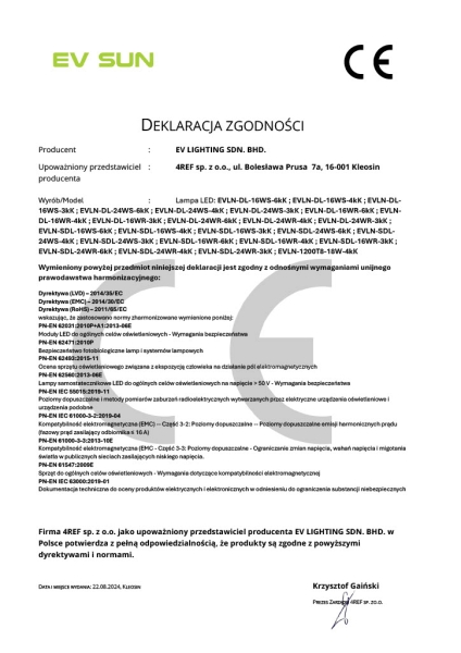 | EVLN-DL-24WR | 24 W | okrągły | 170 x H29 mm | φ154 | IP 20 | 3000 K/ 4000 K/ 6000 K | 2520 lm | 120° | E | do 50 000 h |